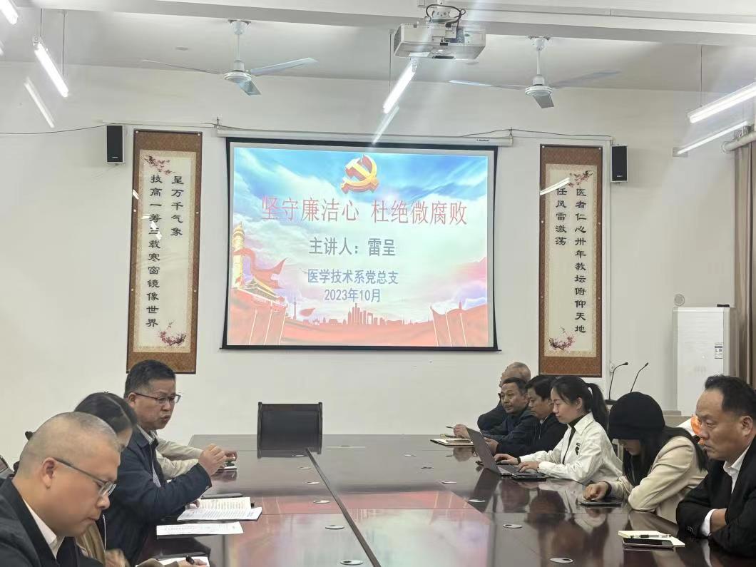 10月11日,系党总支副书记雷呈以“坚守廉洁 杜绝微腐败”为主题,对医技系全体教职工开展廉洁讲座,教职工面对面的交流,分享廉洁教育的经验和心得,深入地了解了廉洁教育的实际应用和意义,进一步增强党性观念,强化廉洁意识。