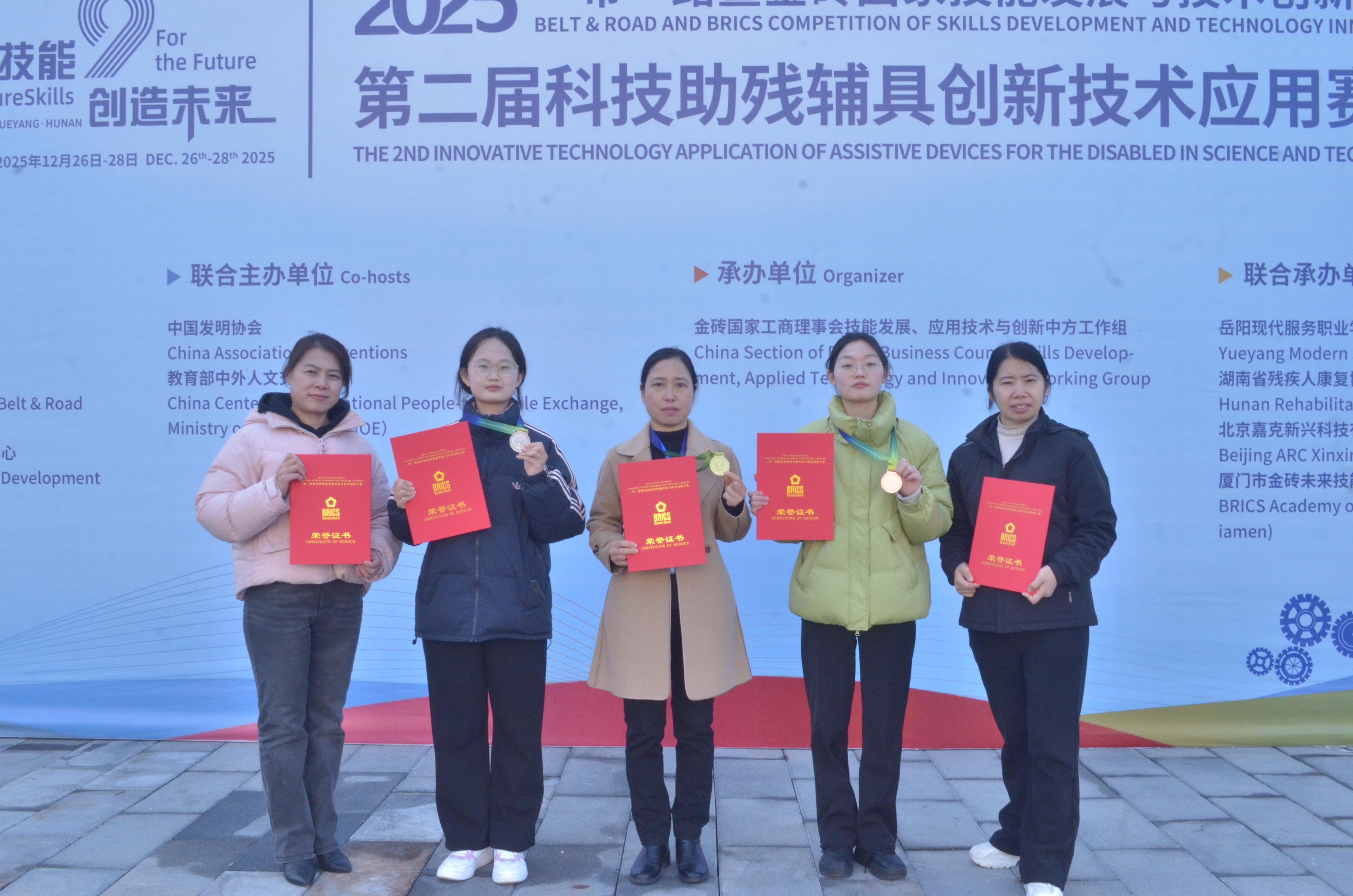 12月26日至28日,“一带一路”暨金砖国家技能发展与技术创新大赛之第二届科技助残辅具创新技术应用赛项决赛在湖南岳阳圆满闭幕。我校眼视光技术专业教师赵小蕊在教师组决赛中斩获一等奖第一名,成功晋级2026年国际赛,两名参赛学生分获二等奖和三等奖。学校同时获得教师组最佳组织奖与学生组优秀组织奖。