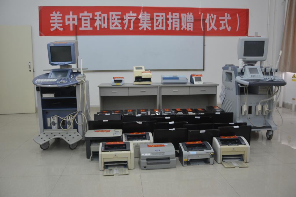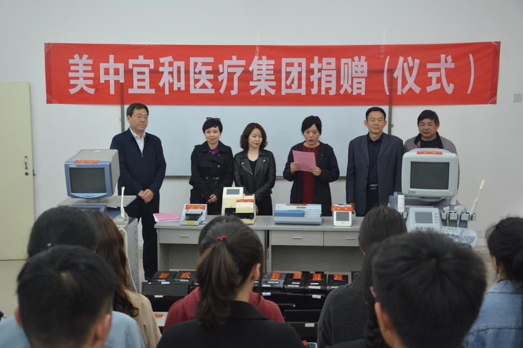 本次北京美中宜和医疗集团向我校捐赠的仪器设备有超声系统诊断仪、检验分析仪、电脑主机、显示器、打印机等,原值达284.6万元,创我校接受社会捐助单次之最。在仪式现场,双方郑重签署了捐赠协议,副校长范真代表学校为美中宜和医疗集团颁发了荣誉证书。