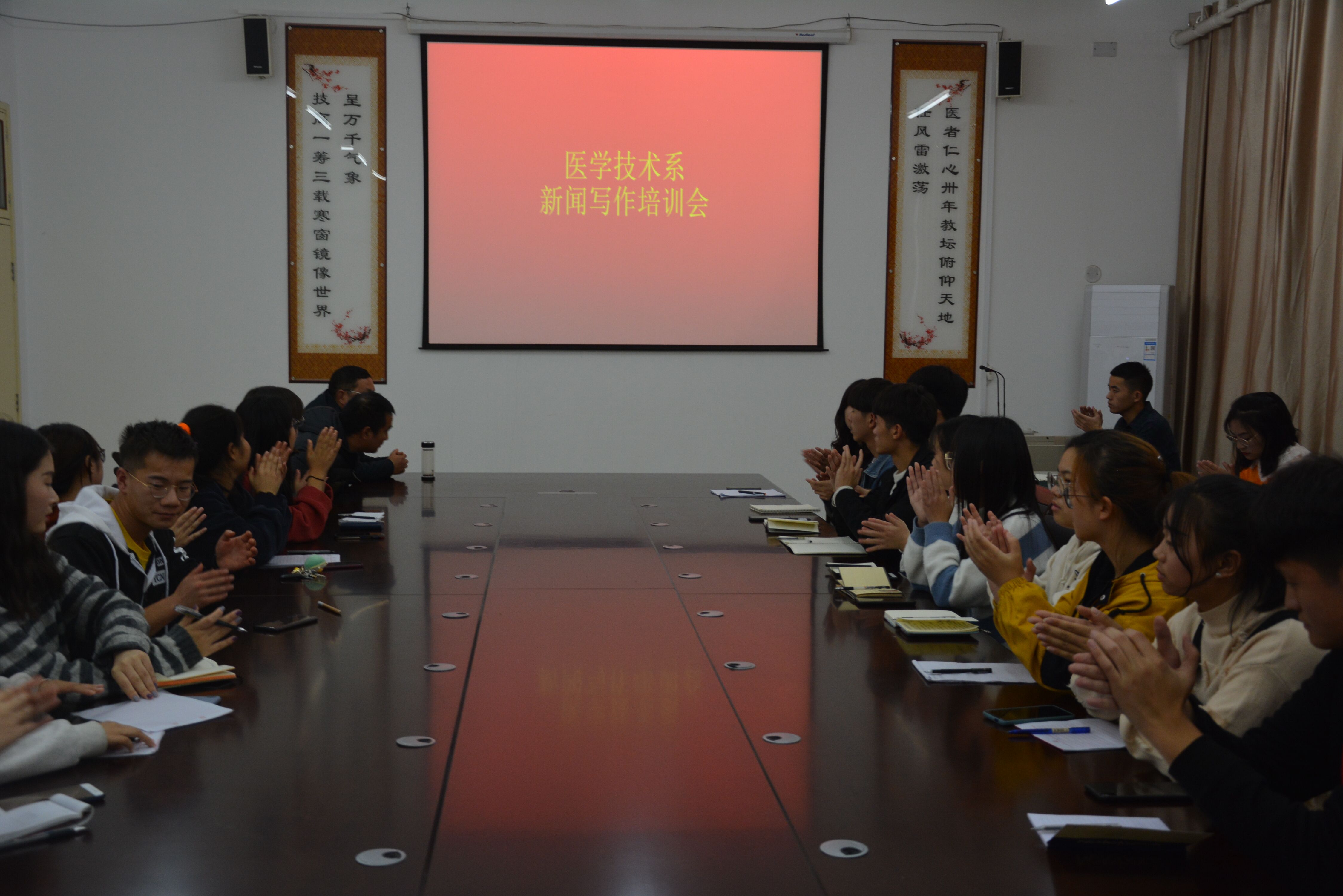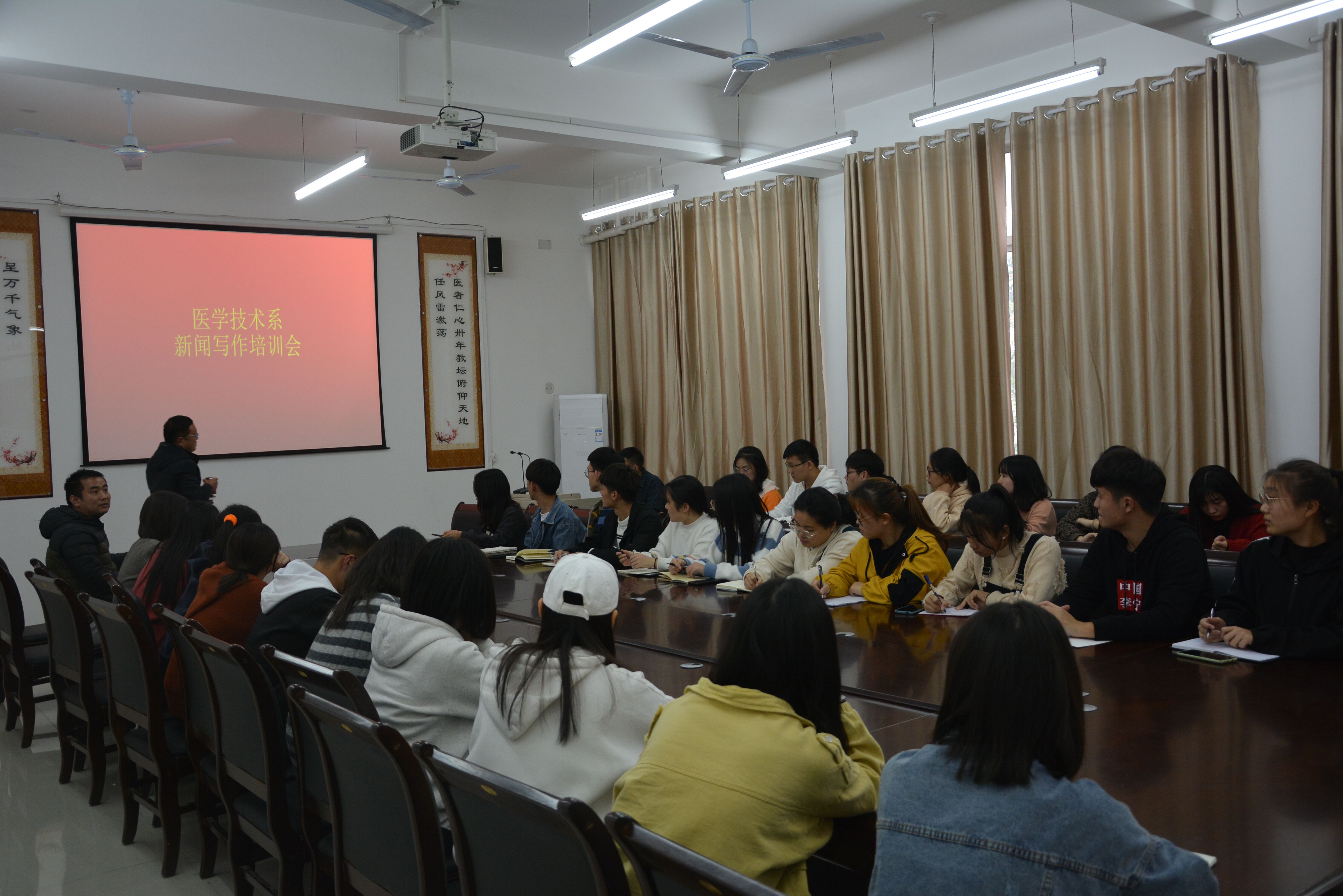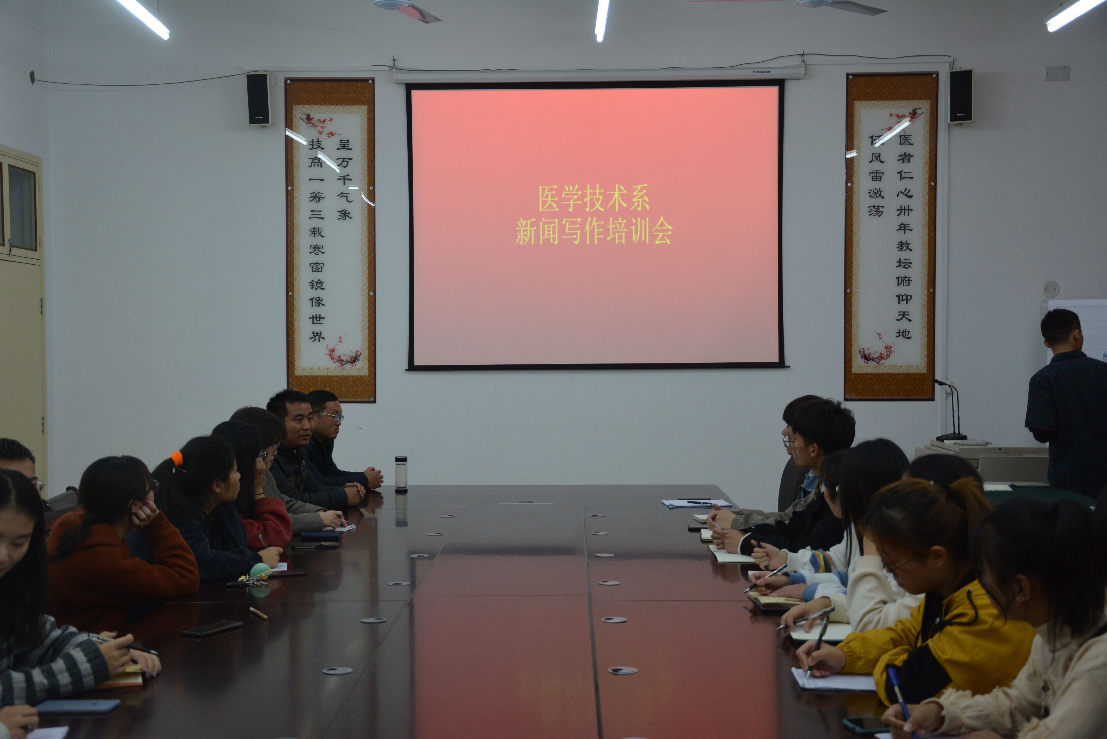11月13日下午,李红普主任和倪立主任在百忙之中抽空与记者站和宣传部成员以及19级各班宣传委员在3号教学楼120室召开“新闻写作培训会”,就如何提高同学们的新闻写作能力做了深层次的讲解。