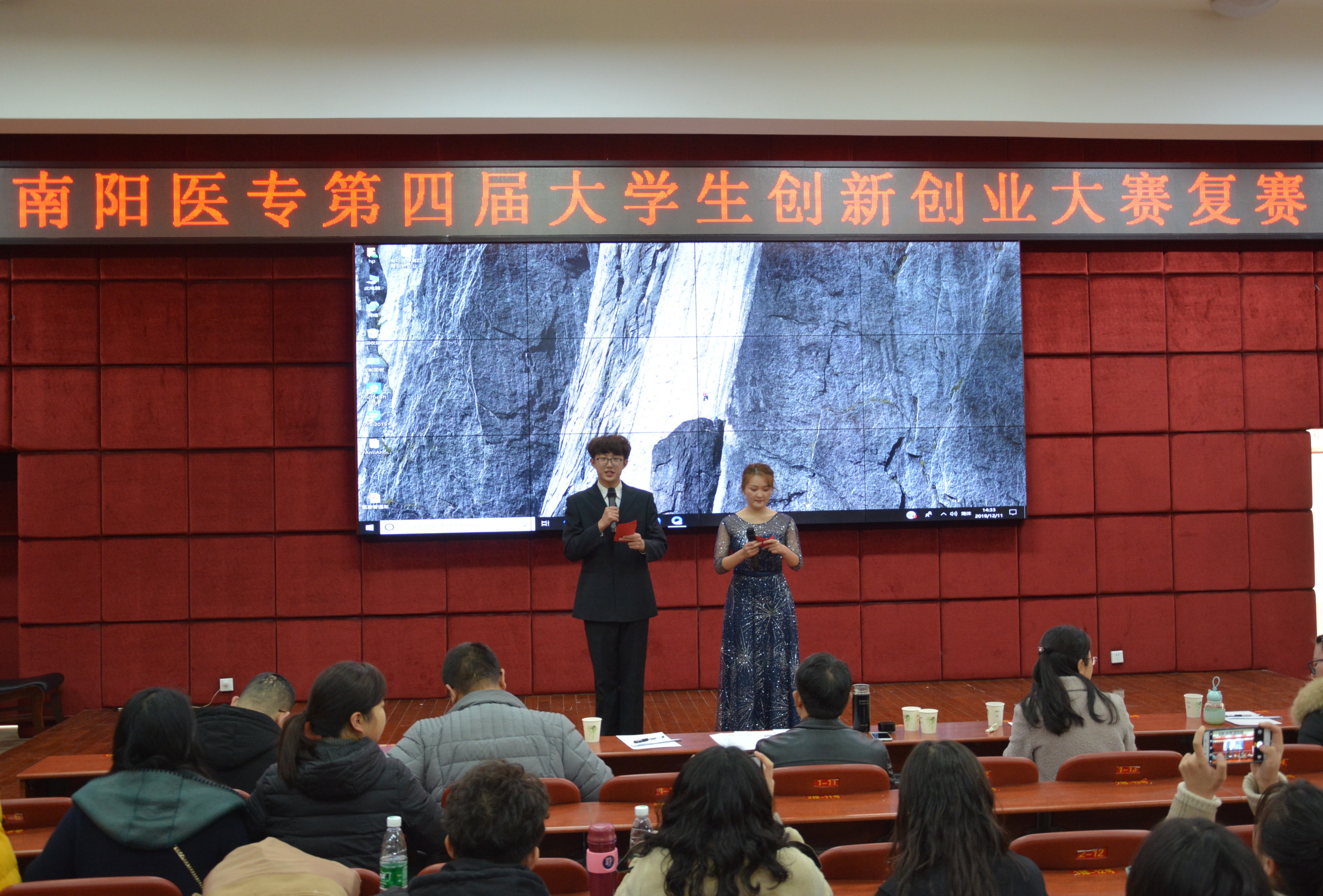 12月11日,我校为贯彻落实全国教育大会精神,同时也为了激发和培养我校学生创新、合作、沟通等多方面的综合素质,特在仲景西区图书馆五楼报告厅内举办了以“创新展风采,筑梦新时代”为主题的大学生创新创业大赛。此次比赛的复赛由我校护理系宗山林、国际教育学院学工办主任习茵、临床医学系学工办主任王川、卫生信息管理系教研室主任纽靖、中医系孙立老师、针灸骨伤系李亚珂老师、以及药学系赵伊娜老师共同担任评委。