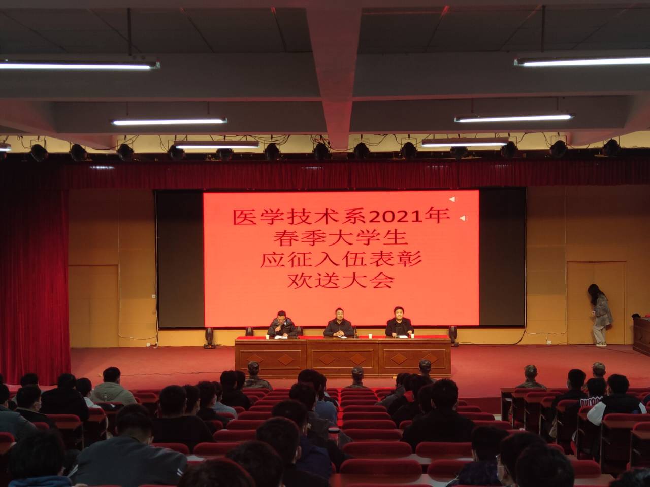 沐浴春风,南医风景依旧。芊芊学子,入伍为国争光。我系为激发适龄学生的报国情怀,激励广大学生积极响应国家号召、踊跃应征入伍、闪耀青春风采。我系于3月10日新东区大礼堂举办应征入伍欢送大会。