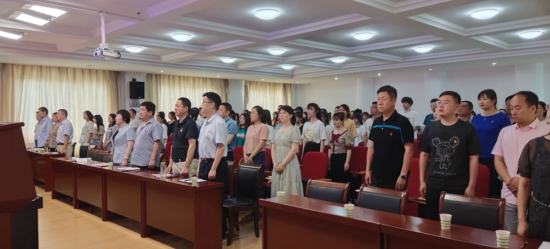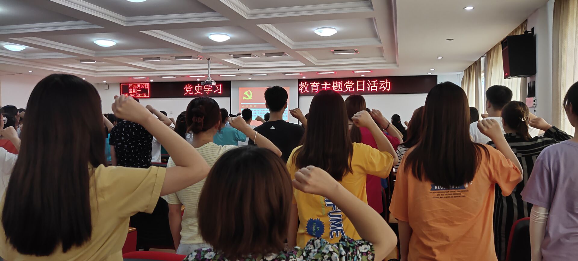 会议第一项,参与会议成员全体起立,神情肃穆,以崇高的敬意奏唱《国际歌》,重温共产党人以昂扬的战斗激情肩负起伟大历史使命。会议第二项,医技系全体新老党员共同宣读入党誓词,医技系党员向党表示了自己愿意承担历史责任的远大理想,坚定了医技系新党员为共产主义事业奋斗终身的信心和决心。会议第三项,校党委委员、纪委书记刘金云发表重要讲话,讲述了革命先烈的家国大义和刚正不阿,他们的精神将永远影响一代又一代共产党人为无产阶级事业奋斗终身,在场人员无一不表示将为南阳医专发展奉献自己的力量。