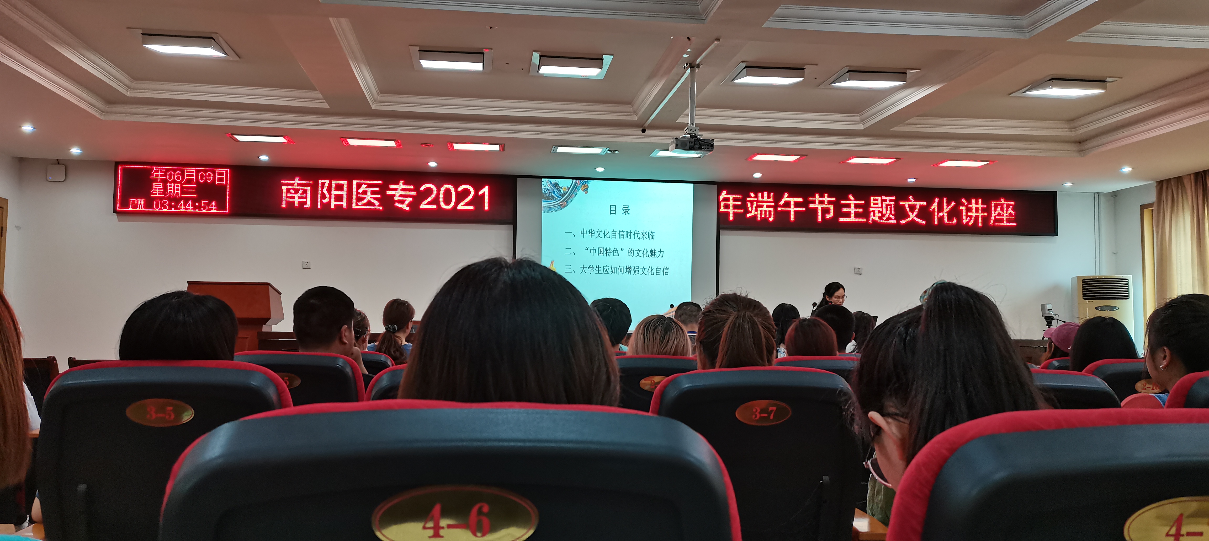 为积极培育和践行社会主义核心价值观,大力弘扬中华优秀传统文化,弘扬时代新风,6月9日下午,我校于主校区一号办公楼五楼会议室举办南阳医专2021年“端午节”主题文化讲座。各系记者站成员及校新媒体成员参加此次讲座。本次讲座,由校党委宣传部副部长杨金运教授作报告,她讲授的题目是“中华文化的魅力”。