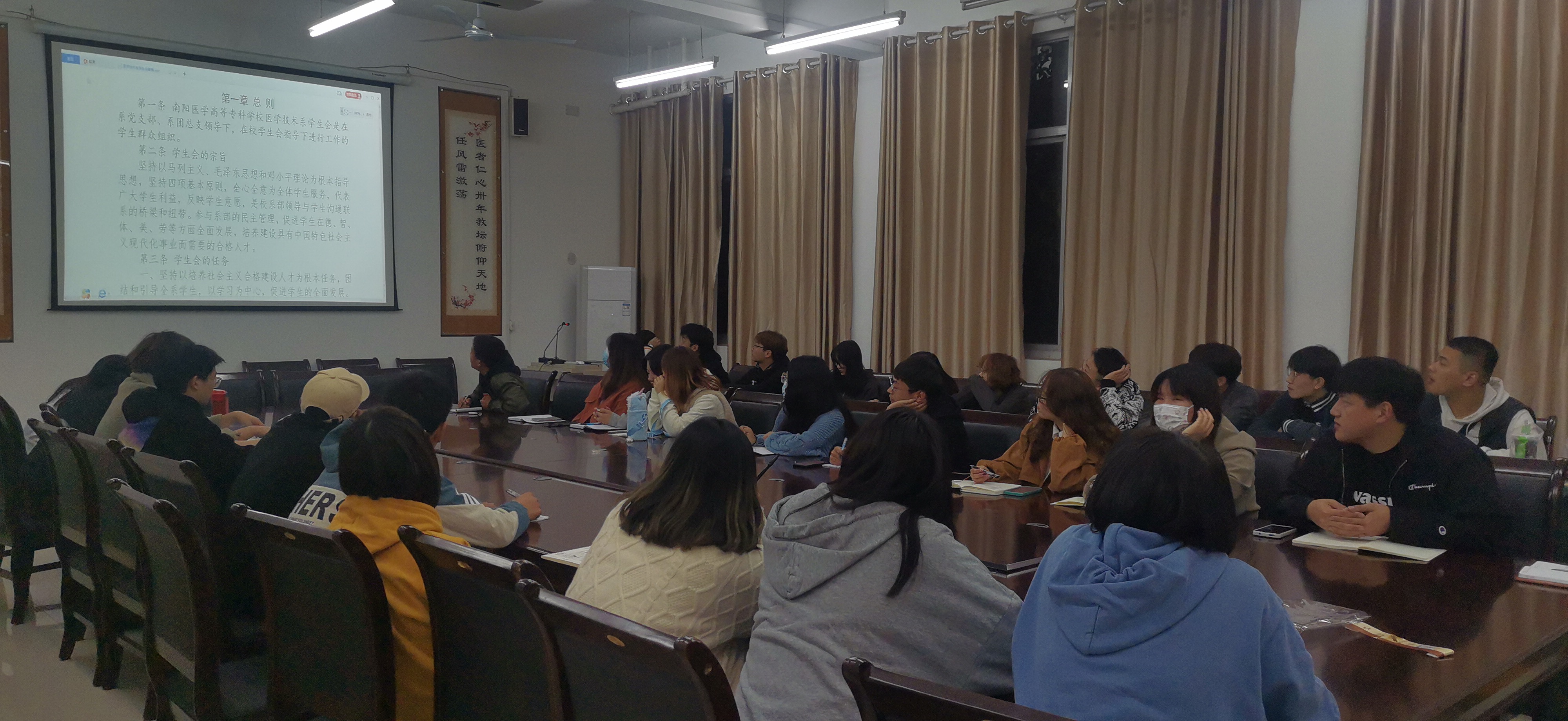 为提高学生干部的思想政治素质和工作能力,明确学生干部的工作任务、工作职责、工作要求,改善学生干部的精神面貌和公众形象,培养一批思想政治素质高,工作能力强,能经得起风浪、耐得住考验,具有开拓创新精神,作风优良的学生干部,同时增进学生干部之间的交流,增强学生干部的责任感。医技系于2021年10月21日晚在3号教学楼120会议室开展学生干部思想政治教育专题培训第一课。此次会议由系学生会主席团成员及各部负责人共同参加。