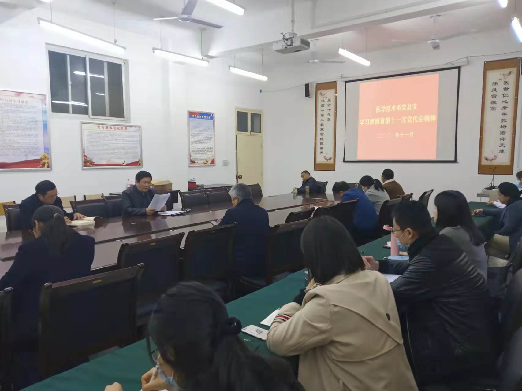 2021年11月12日,医技系在仲景西区三号楼120会议室集体学习中国共产党河南省第十一次代表大会会议精神。会议由系党总支书记杨明勋主持讲话,医技系全体党员教师参加本次学习会议。