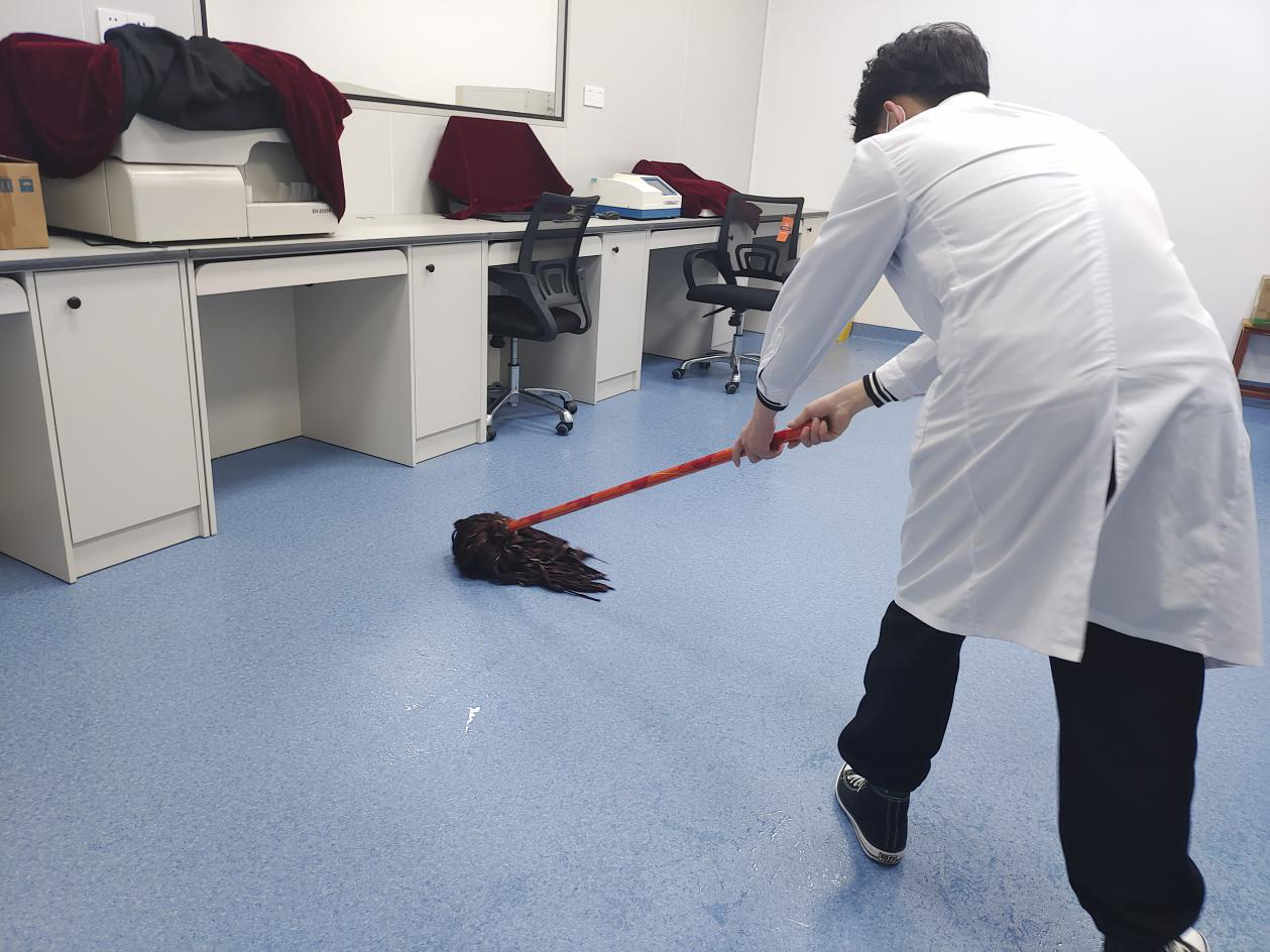 赵景颇老师向同学们解释清扫实验室的重要性:“建立实验室的目的是为了满足检测校准的质量要求,而影响这一检测质量的因素除了检测人员的专业素养、仪器设备的精密度以外,实验室环境的控制也尤为重要。因此,同学们要重视实验室环境质量的控制,这对于我们实验数据的准确性有着重大意义。”