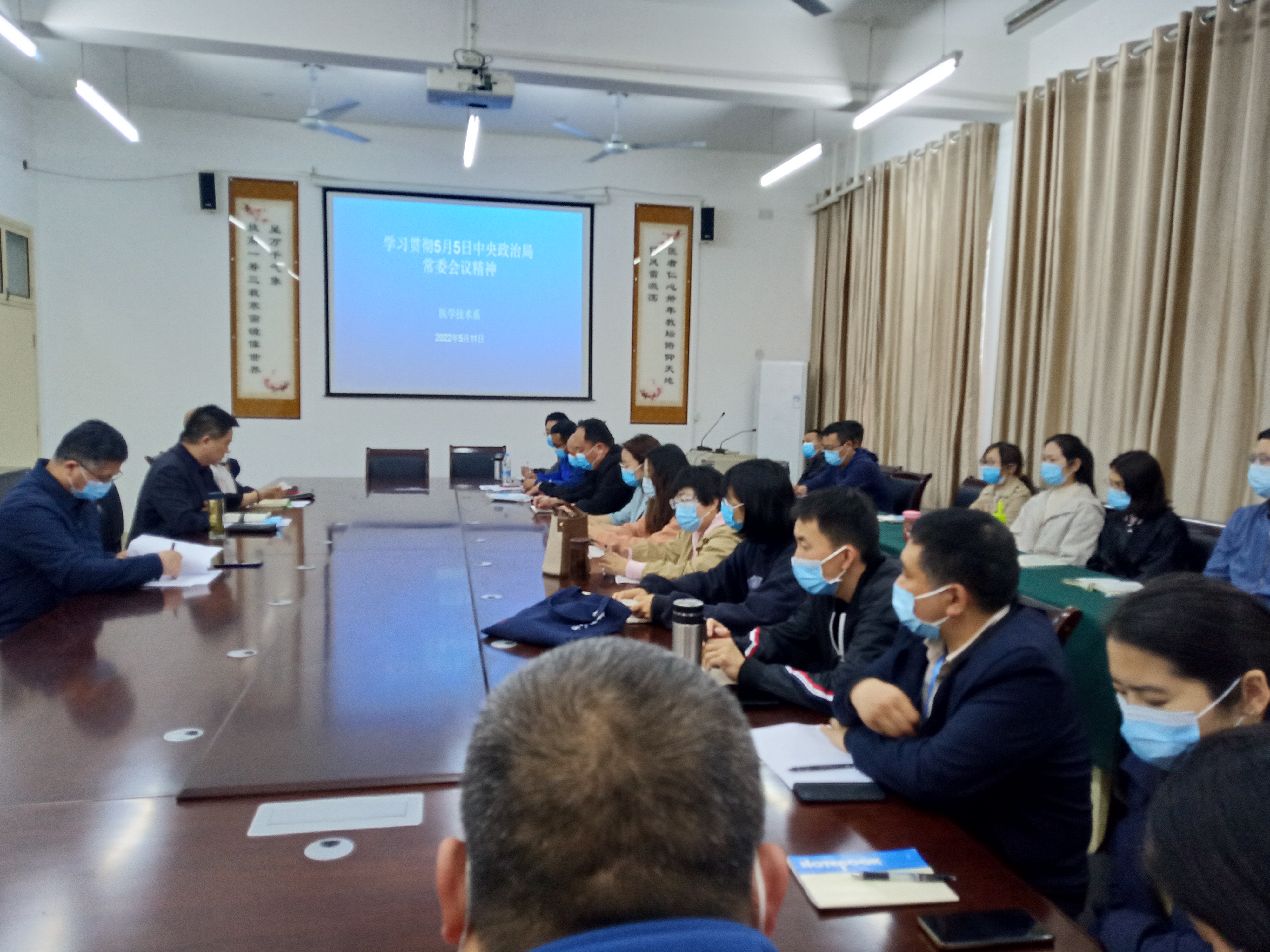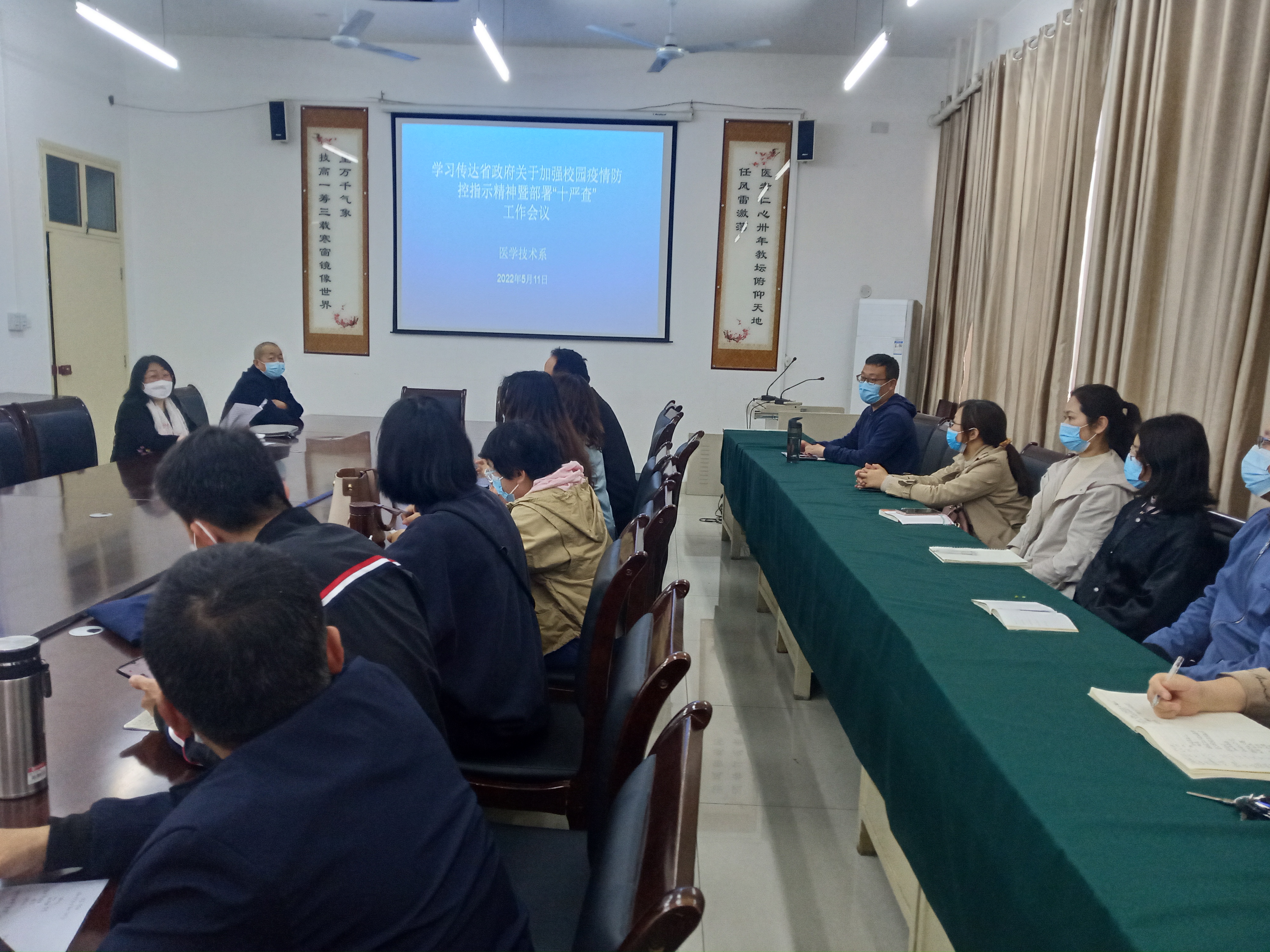 5月11日,太阳成集团tyc539于仲景西区三号教学楼120会议室集中学习传达学校疫情防控工作会议精神。会议由系党总支书记孙振国主持,医技系全体教师参加。