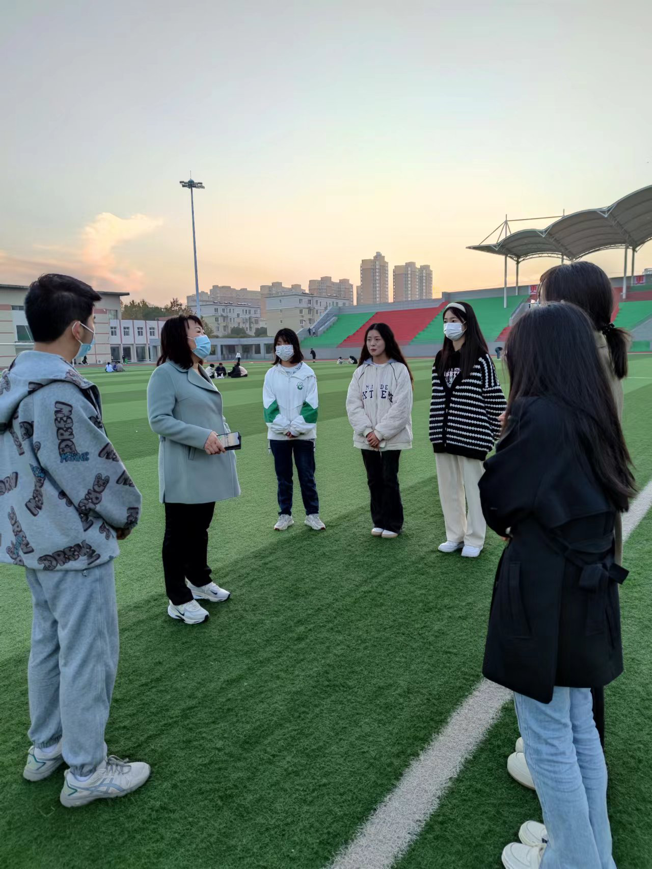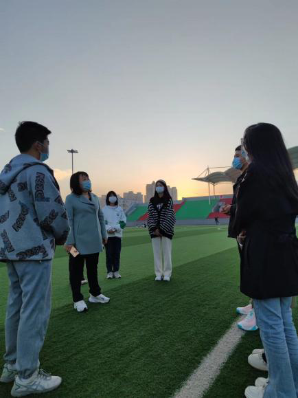 在操场上,刘金云书记与同学们进行了亲切的交谈。谈心采用了双向互动、面对面、阳光运动的交流方式。一是仔细询问了常态化疫情防控期间学生们的学习与日常生活情况;二是倾听了学生们的学习需求与建议意见;三是详细了解学生们在学习中的具体问题,叮嘱同学们在疫情期间不仅学习不能松懈,体质也不能下降,在课余生活中要加强体育锻炼,做好自我防护,保持健康心态,共同营造平稳安全有序的校园环境。
