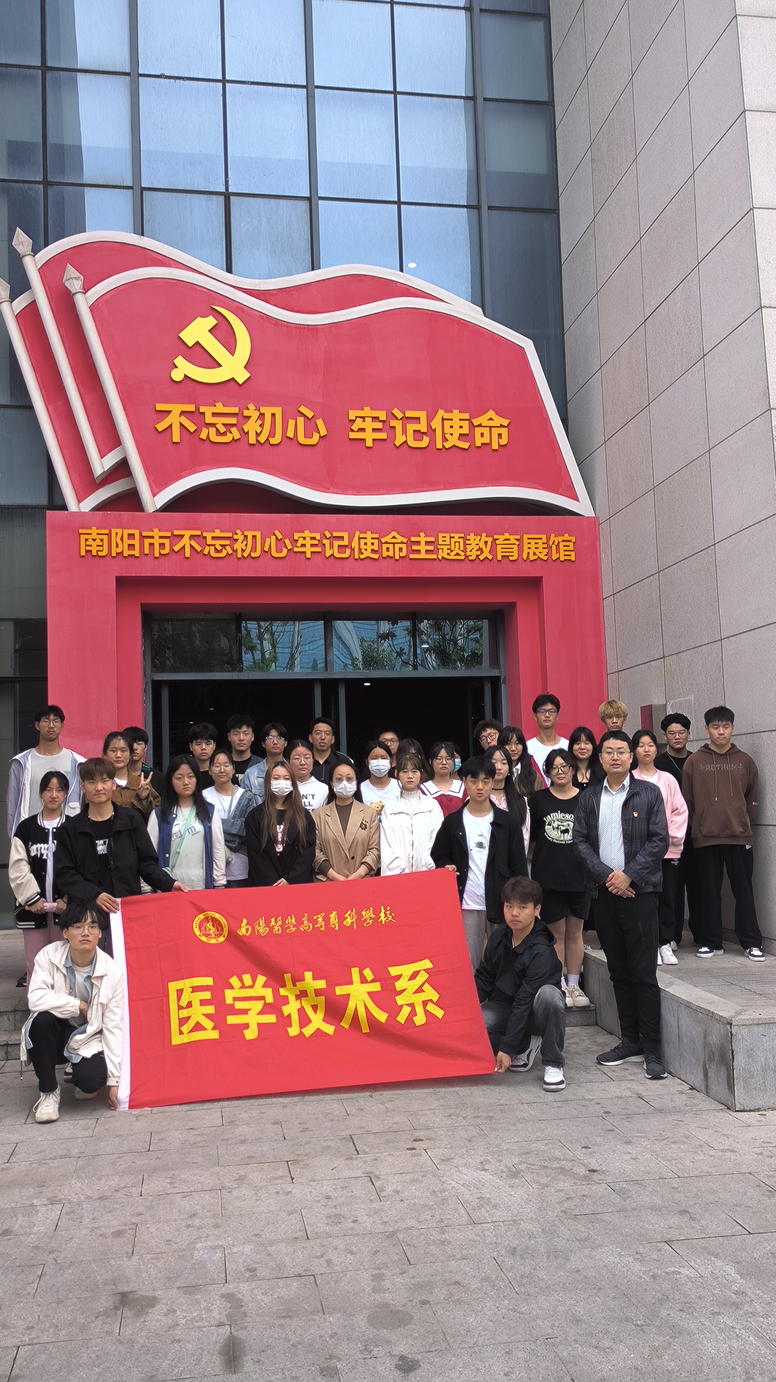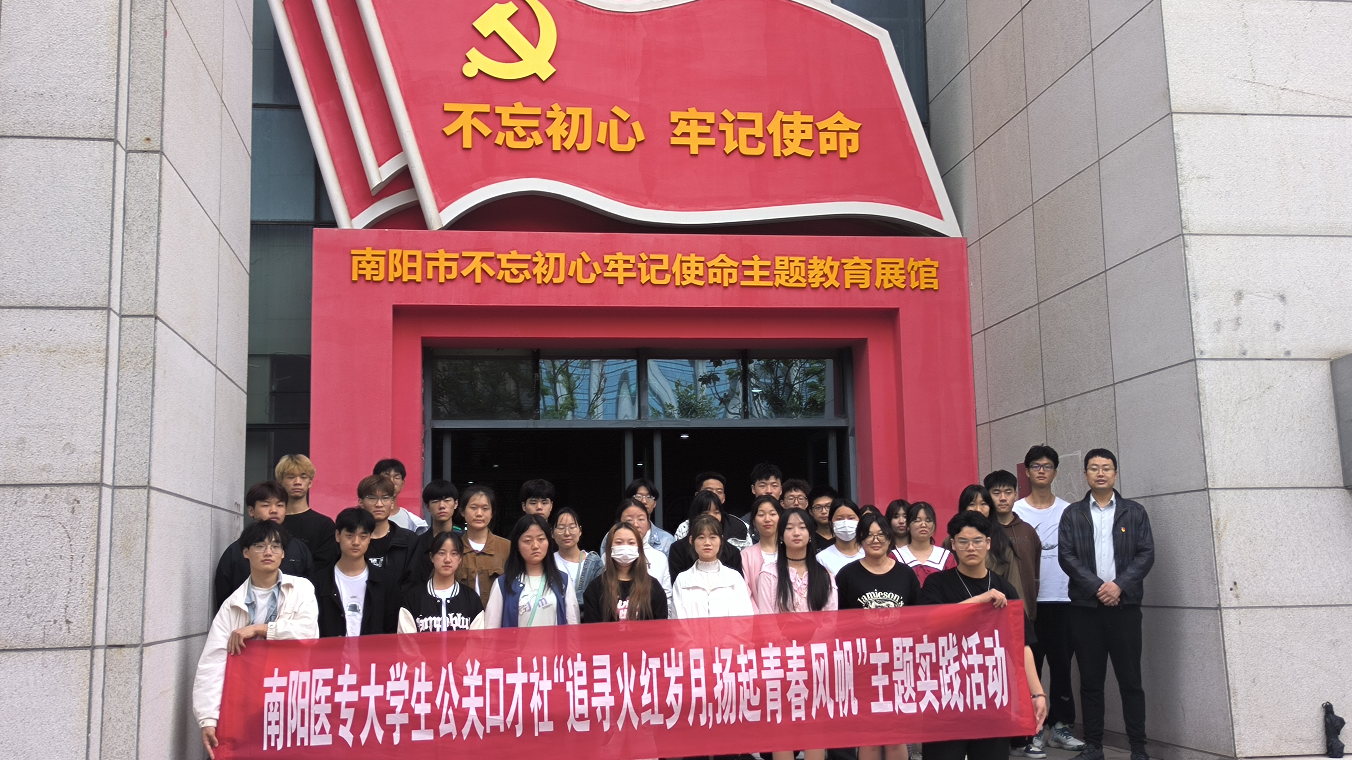 为弘扬传承“五四”爱国主义精神,引导广大青年听党话、跟党走,扎实推进学习贯彻习近平新时代中国特色社会主义思想教育,太阳成集团tyc539南阳医专大学生公关口才社于2023年5月4日前往南阳市“不忘初心,牢记使命”主题教育展馆,开展“追寻火红岁月,扬起青春风帆”户外实践活动。在生动实践中传承弘扬五四精神,厚植爱党、爱国、爱社会主义情怀。