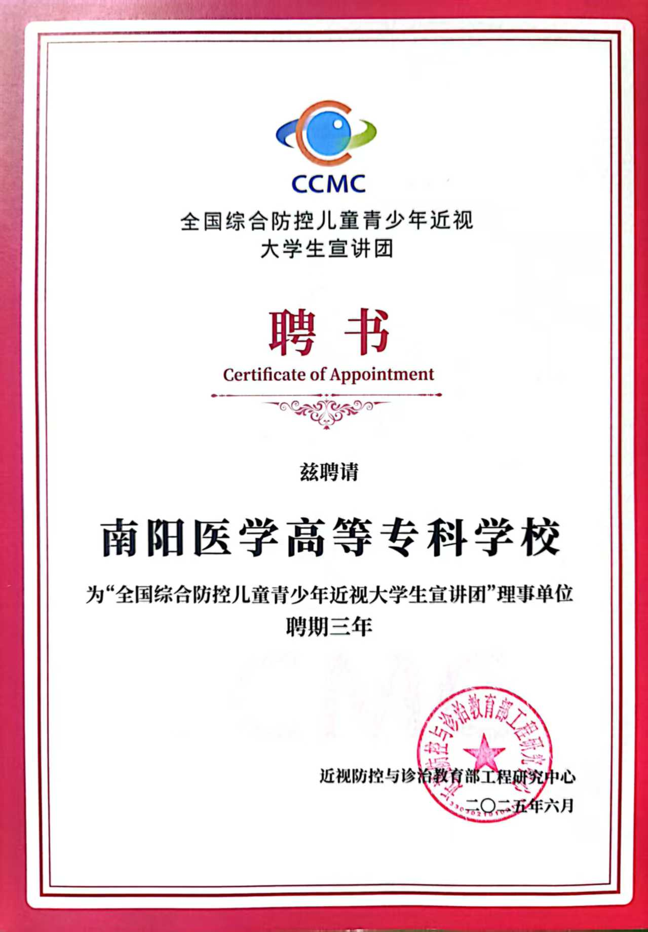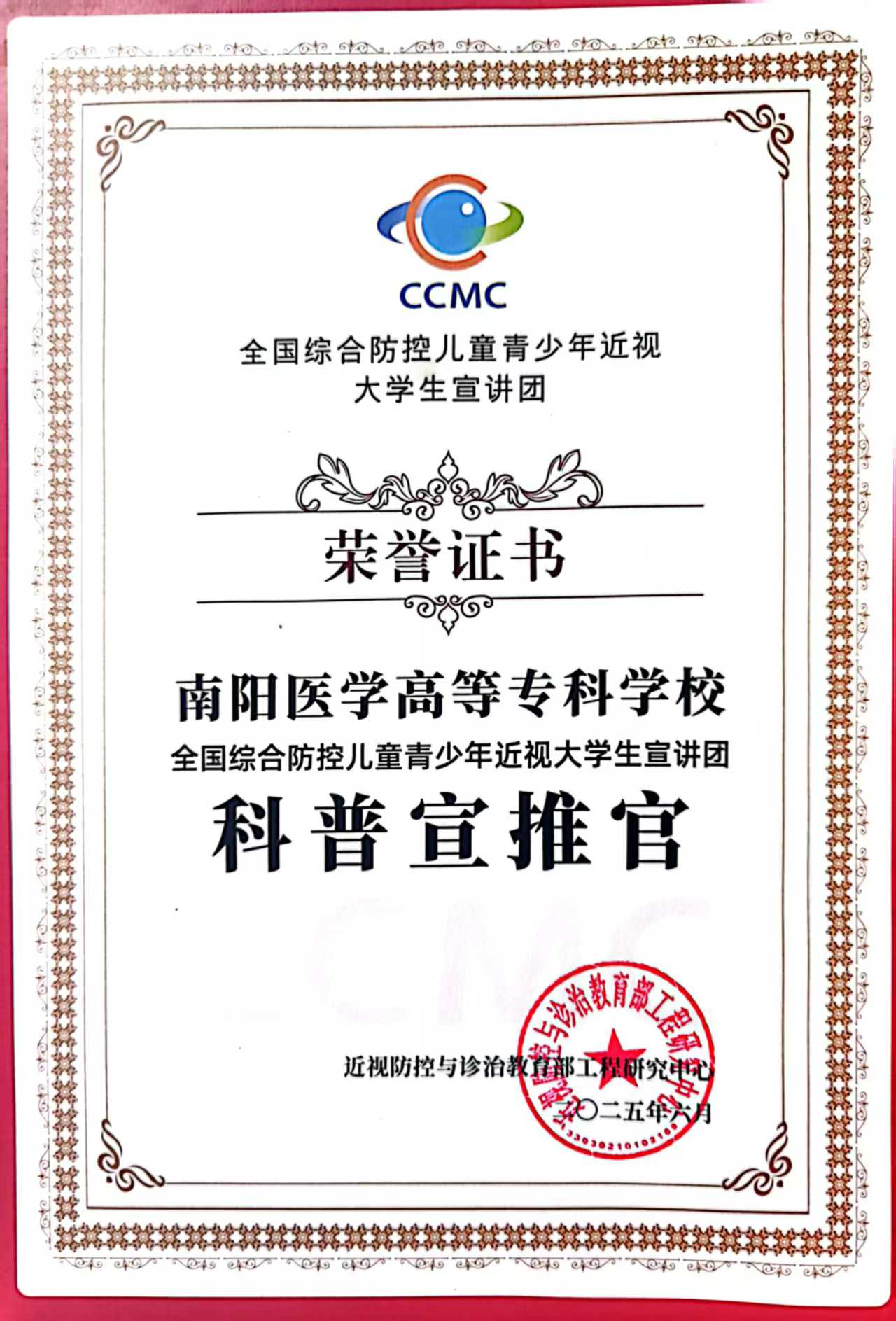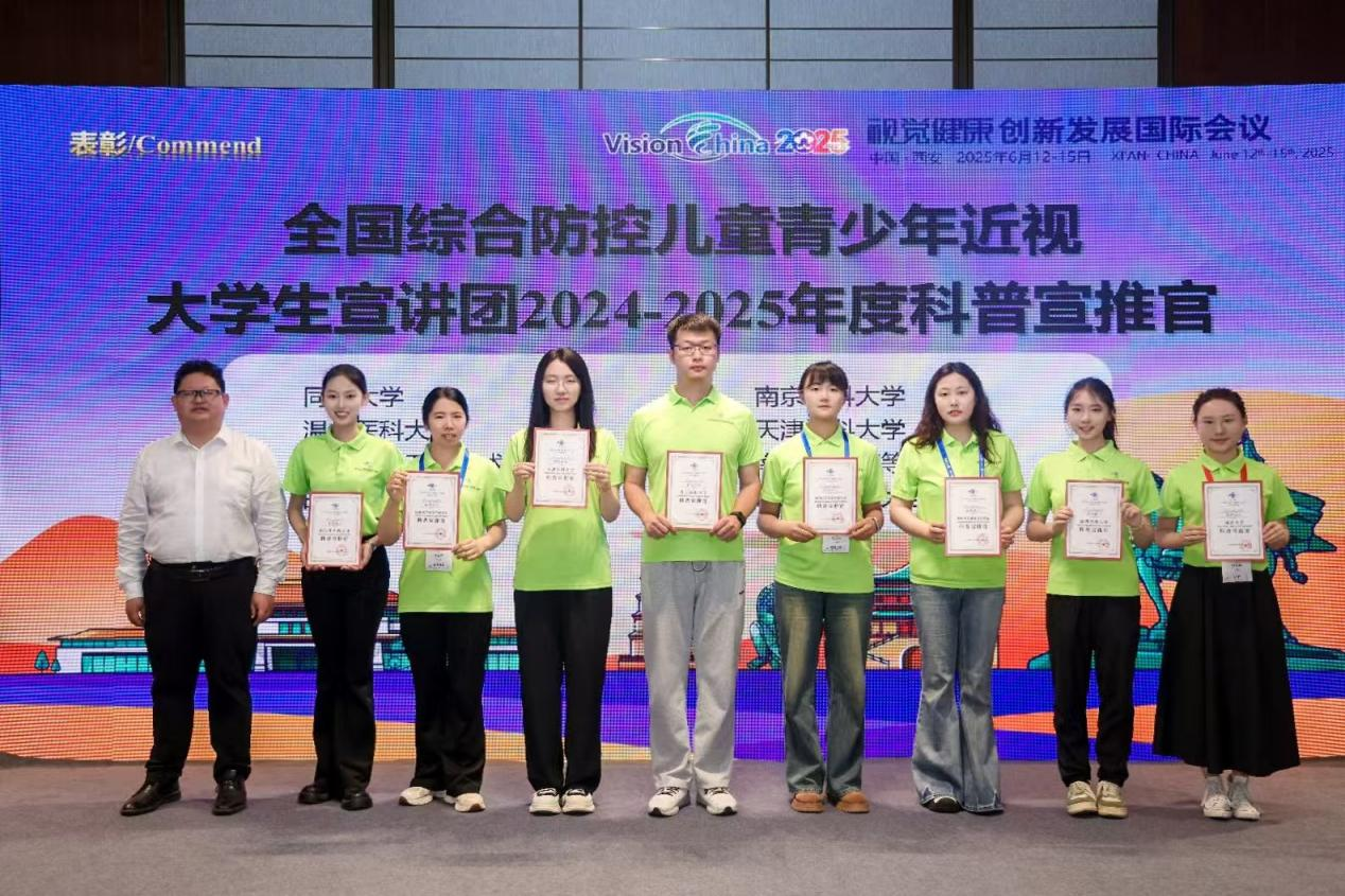 2025年6月13日,全国综合防控儿童青少年近视大学生宣讲团交流活动在西安圆满落幕。我校大学生近视防控宣讲团由于出色的科普宣讲惠及人次数,从全国72所高校中脱颖而出,被教育部近视防控与诊治工程研究中心授予2024-2025年度“科普宣推官”荣誉称号,全国仅八所高校获此荣誉称号。同时,我校2023级眼视光技术专业关蕾同学创作的科普视频《紧急通知!你的“眼力账户”即将透支?》斩获全国近视防控科普大赛三等奖。