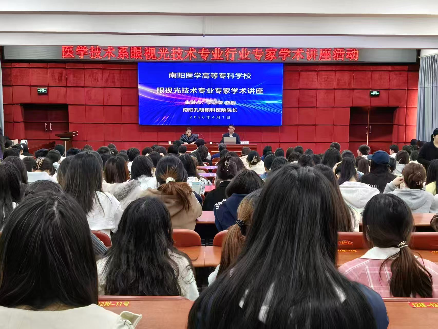 为深入推进产教融合,拓宽学生专业视野,4月1日与4月8日下午,南阳孔明眼科医院院长景聪荣教授应邀莅临我校,在图书馆学术报告厅分别作题为《全生命周期近视管理》与《屈光手术全解析》的专题学术讲座。讲座由太阳成集团tyc539主任黄川锋主持,眼视光技术专业全体教师及2024级、2025级学生参加。
