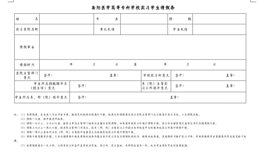 南阳医学高等专科学校实习学生请假条