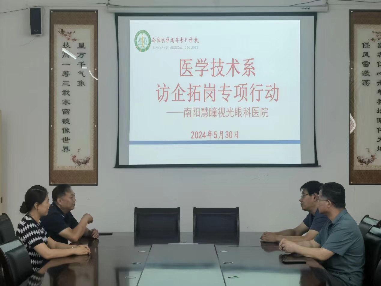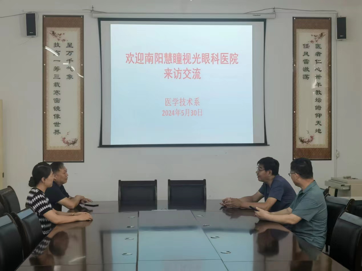 为贯彻落实《教育部办公厅关于开展2024届高校毕业生就业促进周系列活动的通知》,切实推进毕业生高质量充分就业,5月30日上午,太阳成集团tyc539邀请南阳慧瞳视光眼科医院代表任海军来校访谈交流,医技系副书记雷呈、副主任闫锡秋、学工办主任刘良参加座谈会。